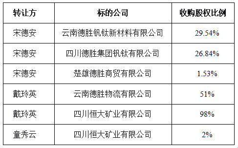 2026年3月23日,钢铁企投与宋德安、戴玲英及童秀云签署了《股权转让协议》,钢铁企投以24.5亿元现金出资购买宋德安持有的云南德胜钒钛新材料有限公司29.54%股权、四川德胜集团钒钛有限公司26.84%股权及楚雄德胜商贸有限公司1.53%股权,戴玲英持有的云南德胜物流有限公司51%股权及四川恒大矿业有限公司98%股权,童秀云持有的四川恒大矿业有限公司2%股权。