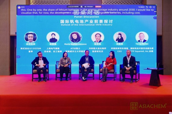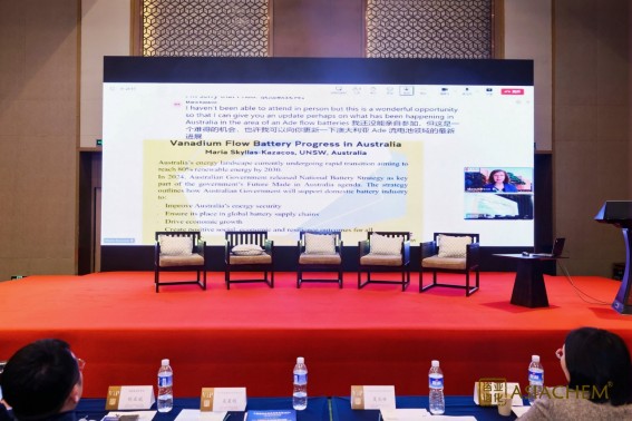 随后,Maria教授以线上视频形式全程参与了圆桌对话环节。该环节以“国际钒电池产业前景探讨”为主题,汇集了来自产学研各领域的多位权威嘉宾,包括:中国科学院大连化学物理研究所首席研究员张华民、上海电气储能科技有限公司总经理兼总工程师杨霖霖、承德新新钒钛储能科技有限公司CEO刘胜男、株式会社LE SYSTEM董事田中利朗,以及国际钒技术委员会副主席、TTP Squared, Inc.总裁Terry Perles。各位专家围绕技术发展、市场挑战与产业合作等议题,展开了深入而富有建设性的交流。
